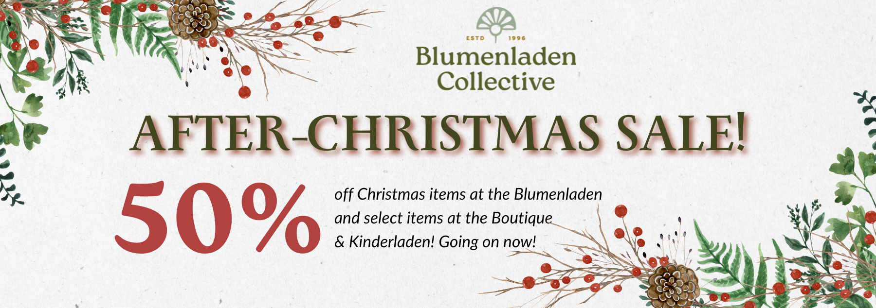 Save 50% on all Christmas-specific items at the Blumenladen! AND…receive 50% off select winter apparel, boots, hats, glove, and scarves at the Boutique – going on now!