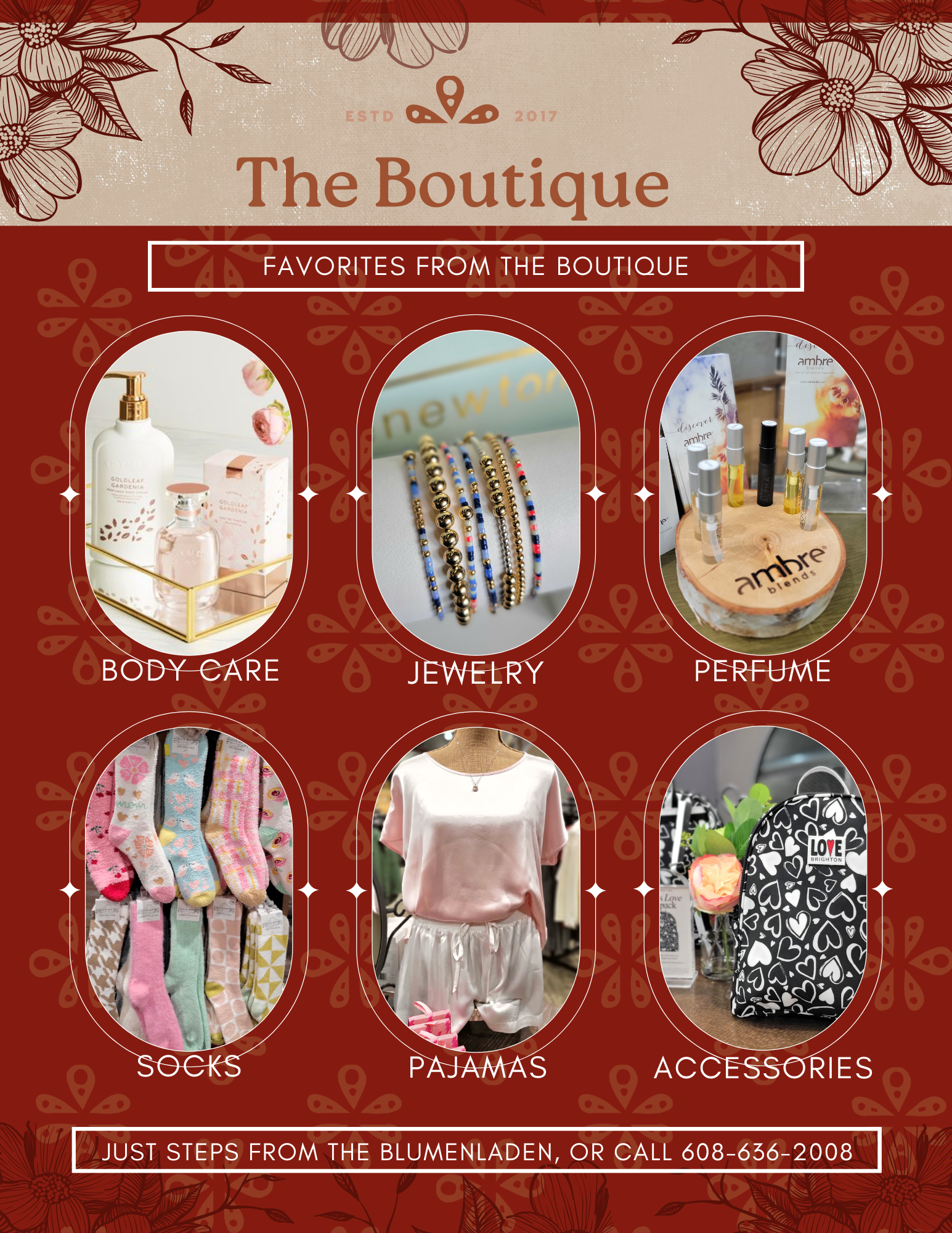 Check out our top picks – from flowers, plants, and chocolates at the Blumenladen to jewelry, lotions, and accessories from the Boutique, it’s THE place to go for Valentine’s Day!